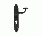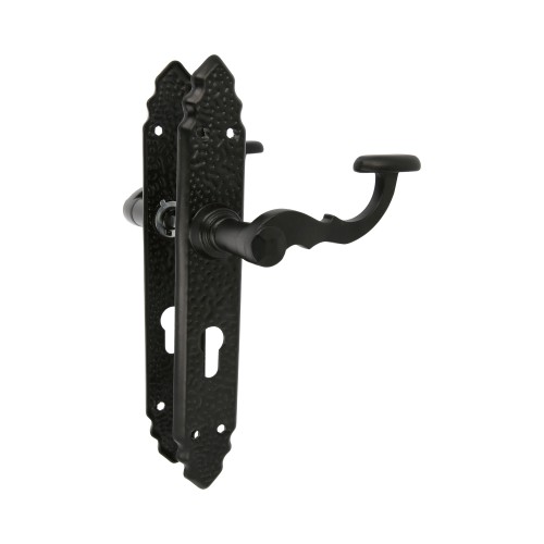 Manilla de zamak con placa martilleada de acero. Con bocallave troquelada para cilindro Europerfil a 85 mm. Cuadradillo de 8 mm. Incluye tornillos pasantes antirrobo.