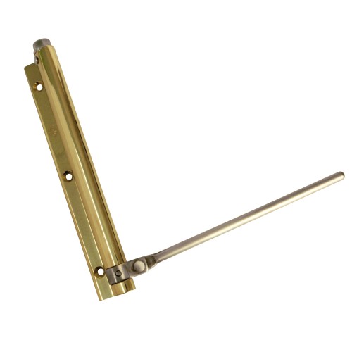 Pernio muelle con brazo en acero inoxidable. Muelle de acero elástico flexible para cierre automático de puertas. Regulación de potencia de cierre, incluye llave Allen. Tirafondos de acero inoxidable 18/8 y soporte de nylon negro. Para puertas ligeras, máximo: 40 kg.