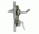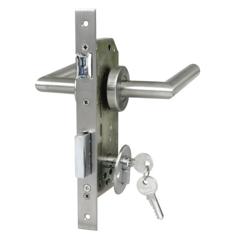 1 Juego de manillas modelo 7RX. 1 Cerradura modelo 340 inoxidable. 1 cilindro de serreta modelo 9500-60 (30-30) mm latón cromo brillo. 2 bocallaves modelo 22 en acero inoxidable. Para puertas de carpintería de madera. Sobre encargo.