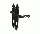 Juego de manillas de zamak con placa martilleada de acero. Con bocallave troquelada para cilindro Europerfil. Cuadradillo de 8 mm.