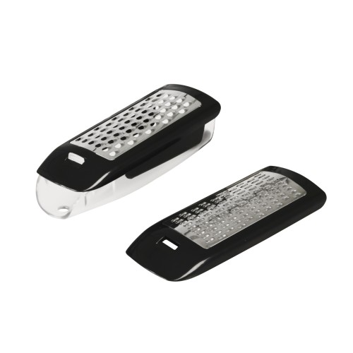 Rallador con cuerpo y depósito en ABS. Con dos cuchillas intercambiables de acero inoxidable. Para rallado fino y grueso.