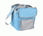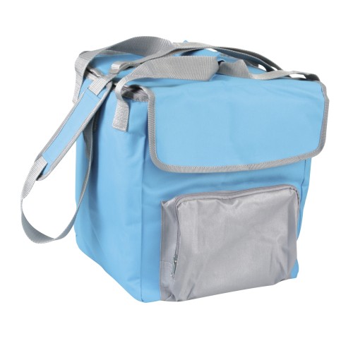 Bolsa portaalimentos flexible, con aislante térmico, asa y bandolera. Diseño en azul y gris con asa, cierre de cremallera y bolsillo frontal externo con cremallera para guardar sus pertenencias en cualquier lugar. Muy resistente y fácil de limpiar.