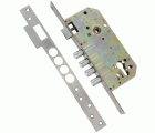 Cerradura de embutir para puertas de madera con bulones de cierre. Canto cuadrado. Frente y soporte. Picaporte reversible de acero cromado. Distancia entre nueca de manilla y alojamiento de cilindro Europerfil: 85 mm. Nueca para manilla de 8 mm. Sin cilindro y sin escudo. Caja cerrada y mecanismo interior de acero bicromatado. 4 bulones de acero cromado, desplazamiento: 20 mm (2 vueltas).
