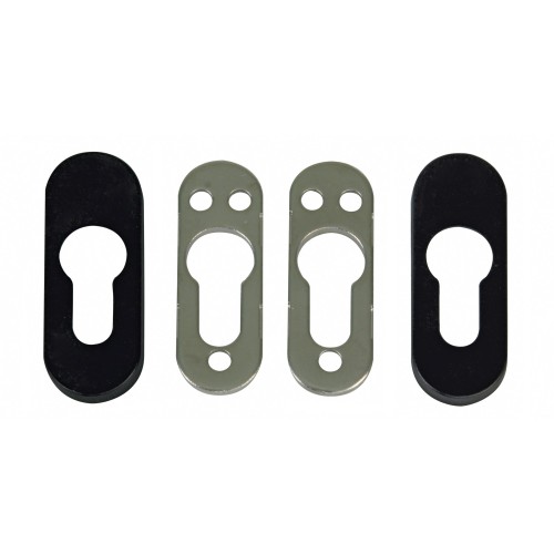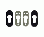 - ESCUDO DE SEGURIDAD PARA CERRADURAS: El escudo de seguridad cuenta con un cuerpo fabricado en zamak, lo que incrementa la fuerza de la pieza, aportando mayor resistencia. Además, incorpora tornillos, embellecedor de plástico y bocallave interior.