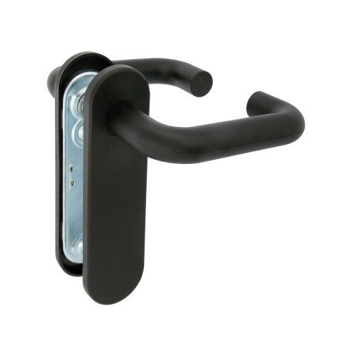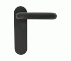 Juego de manillas con núcleo de acero y recubrimiento de polipropileno negro mate, que confiere rigidez y dureza, ausencia de carga electrostática, alta resistencia frente a los disolventes y estabilidad respecto las diferencias de temperaturas. Fijación mediante tornillos pasantes antirrobo.