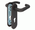Juego de manillas con núcleo de acero y recubrimiento de polipropileno negro mate, que confiere rigidez y dureza, ausencia de carga electrostática, alta resistencia frente a los disolventes y estabilidad respecto las diferencias de temperaturas. Con bocallaves a 72 mm. Fijación mediante tornillos pasantes antirrobo.