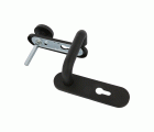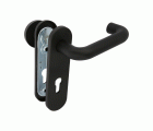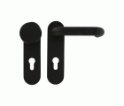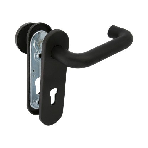 Juego de manilla y pomo con núcleo de acero y recubrimiento de polipropileno negro mate, que confiere rigidez y dureza, ausencia de carga electrostática, alta resistencia frente a los disolventes y estabilidad respecto las diferencias de temperaturas. Con bocallaves a 72 mm. Fijación mediante tornillos pasantes antirrobo.