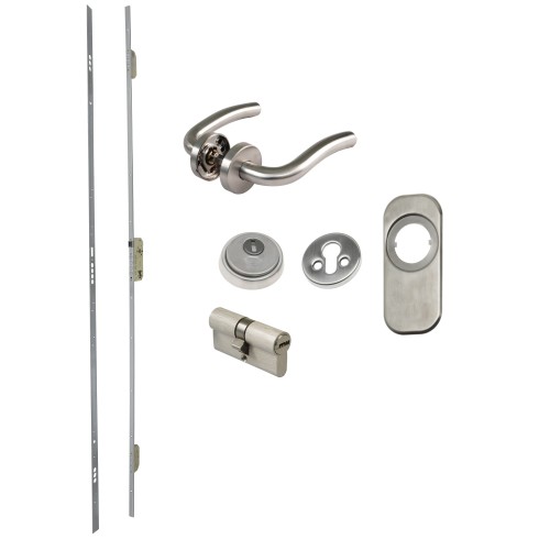 Kit formado por 1 juego de manillas modelo 19RX de acero inoxidable. 1 cerradura modelo 400 esmaltada plata. 1 escudo modelo 31 inoxidable. 1 embellecedor modelo 10 acero inoxidable. 1 cilindro de seguridad modelo 9850-60 (30-30) mm latón cromo mate. Para puertas de carpintería de madera. Sobre encargo.
