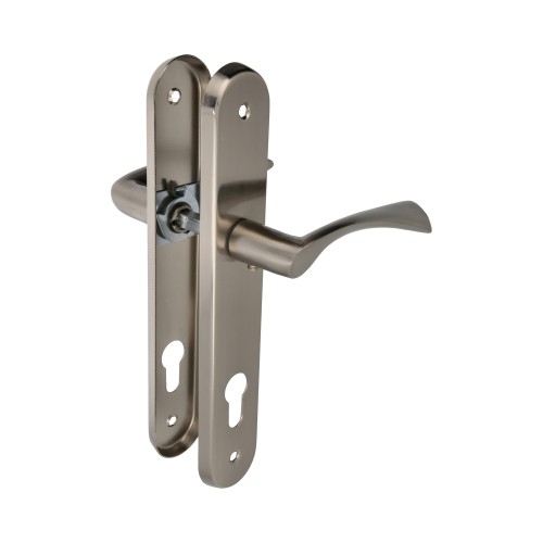 Juego de manillas con tirador de zamak y placa de acero. Incluye accesorios de fijación. Con bocallave.