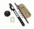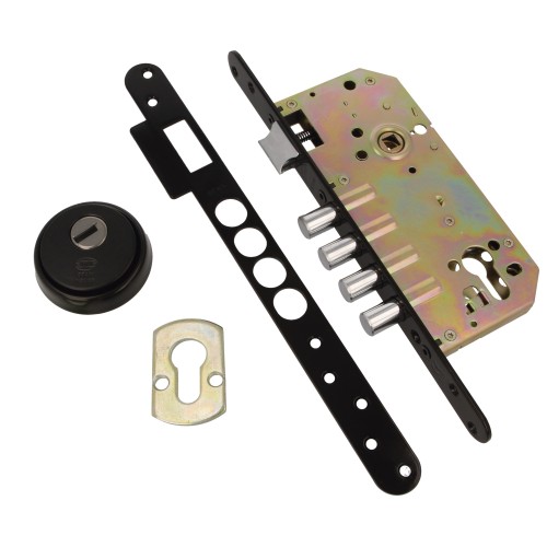 Cerradura de embutir para puertas de madera con bulones de cierre. Canto redondo. Frente y soporte. Picaporte reversible. Caja cerrada y piezas internas de acero bicromatado. Distancia entre nueca de manilla y alojamiento de cilindro Europerfil: 85 mm. Nueca para manilla de 8 mm. Desplazamiento: 20 mm (2 vueltas). Sin cilindro. Escudo de seguridad modelo 31. Homologada con marcado CE según norma EN 12209:2004.