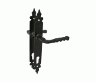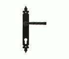 Juego de manillas fabricadas con placas de acero y manillas de zamak. Placa estrecha. Con bocallave troquelado para cilindro Europerfil de 90 mm. Cuadradillo de 8 mm. Sin muelle de recuperación.