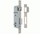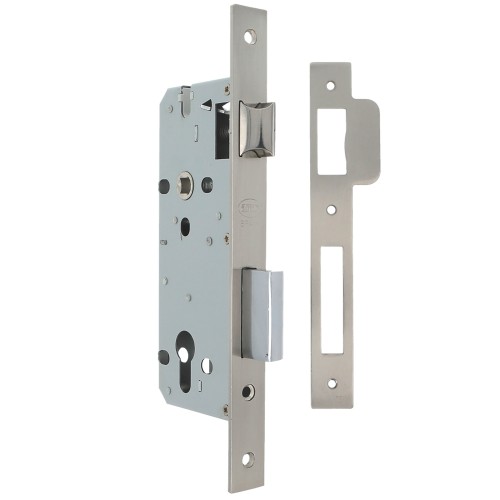Cerradura de embutir para puertas de madera con paletón de cierre. Canto cuadrado. Frente y soporte. Picaporte reversible de acero inoxidable 18/8. Pasador de acero cromado. Distancia entre nueca de manilla y alojamiento de cilindro Europerfil: 85 mm. Entrada: 45 mm. Nueca para manilla de 8 mm. Sin cilindro.