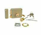 Cerradura de sobreponer de cilindro suelto para puertas de madera. Cilindro de latón macizo de 6 pines. Pestillo, palanca y tirador de latón macizo. Desplazamiento de palanca 20 mm (2 vueltas de llave). 3 llaves de serreta de latón niqueladas. Entrada: 50 mm. Adaptable a puertas de 35 a 80 mm.