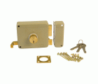 Cerradura sobreponer con cilindro de latón macizo de 50 mm. Pestillo, palanca y tirador de latón macizo. Cuerpo de acero pintado. Desplazamiento de palanca 20 mm (2 vueltas de llave). Apertura de izquierdas.