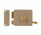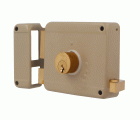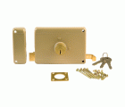 Cerradura sobreponer con cilindro de latón macizo de 50 mm. Pestillo, palanca y tirador de latón macizo. Cuerpo de acero pintado. Desplazamiento de palanca 20 mm (2 vueltas de llave). Apertura de derechas.