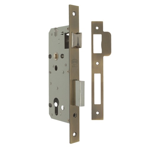 Cerradura de embutir para puertas de madera con paletón de cierre. Canto cuadrado. Frente y soporte. Picaporte reversible de acero inoxidable 18/8. Pasador de acero cromado. Distancia entre nueca de manilla y alojamiento de cilindro Europerfil: 85 mm. Entrada: 45 mm. Nueca para manilla de 8 mm. Sin cilindro.