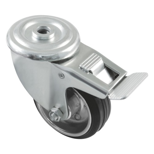 Rueda con núcleo metálico. Con agujero y freno. Banda de goma negra con rodamiento de rodillos. Buena resistencia a la abrasión y silenciosa. Uso semi-industrial.