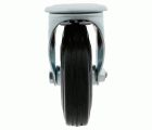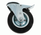 Rueda de goma negra con soporte embutido de chapa de acero con doble hilera de bolas con freno. Uso universal para cargas medias. Especialmente diseñado para transporte industrial.
