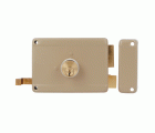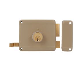 Cerradura sobreponer con cilindro de latón macizo de 50 mm. Pestillo, palanca y tirador de latón macizo. Cuerpo de acero pintado. Desplazamiento de palanca 20 mm (2 vueltas de llave). Apertura de derechas.
