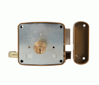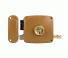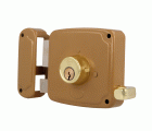 Cerradura de sobreponer para puertas de madera. Cilindro redondo de latón Ø25x50 mm de 5 pines. Con palanca de cierre, lengüeta y tirador. Desplazamiento de palanca 20 mm (2 vueltas de llave). 3 llaves de serreta. Llave en bruto modelo 6410.