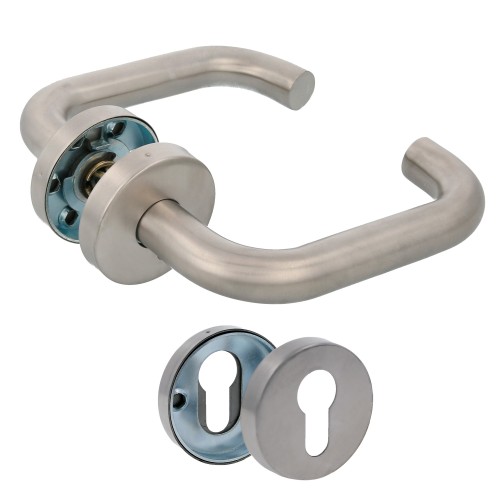 - JUEGO DE MANILLAS CON ROSETA: Juego de manillas de Acero Inoxidable con roseta redonda, para puertas de interior o exterior. De diseño sencillo y moderno, con cómoda manivela que se adapta a la mano y no resbala. Se recomienda limpiar con un paño húmedo.