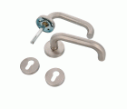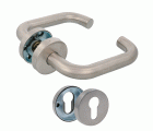 Juego de manillas de acero inoxidable. Con roseta interior de acero niquelado. Cuadradillo de 8 mm. Incluye bocallaves para llave de gorja. Serie económica.