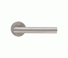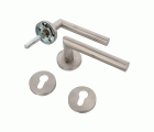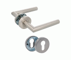 Juego de manillas de acero inoxidable. Con roseta interior de acero niquelado. Incluye bocallaves para cilindros europerfil. Cuadradillo de 8 mm. Serie económica.