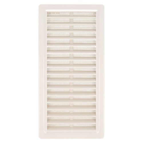 Rejilla de ventilación de ABS con mosquitera. Lamas inclinadas que dirigen el flujo de aire.