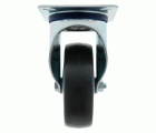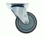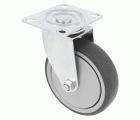 Rueda con pletina metálica giratoria. Banda de goma gris de caucho termoplástico. Núcleo de polipropileno. Diseñado para usos hospitalarios, hosteleria y similares