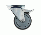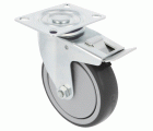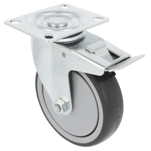 Rueda con pletina metálica giratoria con freno. Banda de goma gris de caucho termoplástico. Núcleo de polipropileno.