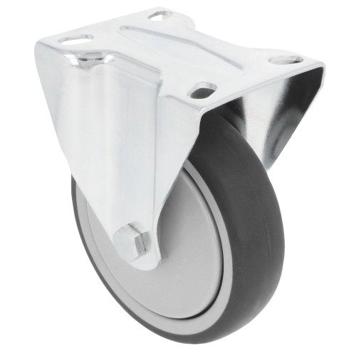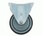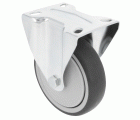 Rueda con pletina metálica fija. Banda de goma gris de caucho termoplástico. Núcleo de polipropileno. Diseñado para usos hospitalarios, hosteleria y similares