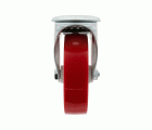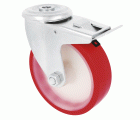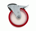 Rueda con pletina metálica con agujero con freno. Banda de poliuretano rojo. Núcleo de nylón blanco. Especialmente diseñada para usos de hostelería, hospitalarios, expositores,mostradores, y decoración.