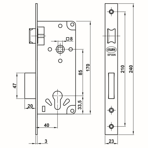 Cerradura de embutir para puertas de madera con paletón de cierre. Canto cuadrado. Frente y soporte en acero. Picaporte reversible. Distancia e ntre nueca de manilla y alojamiento de cilindro europerfil: 85 mm. Entra da: 40 mm. Nueca para manilla de 8 mm. Incluye un cilindro de 60 (30-30) .