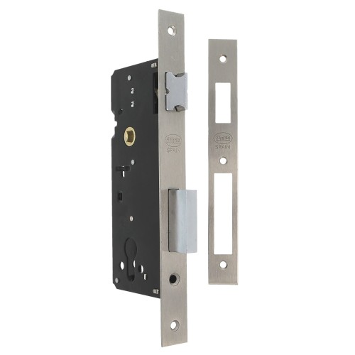 Cerradura de embutir para puertas de madera con paletón de cierre. Canto cuadrado. Frente y soporte en acero. Picaporte reversible. Distancia entre nueca de manilla y alojamiento de cilindro Europerfil: 85 mm. Entrada: 45 mm. Nueca para manilla de 8 mm. Sin escudo ni cilindro. Para el mercado griego.