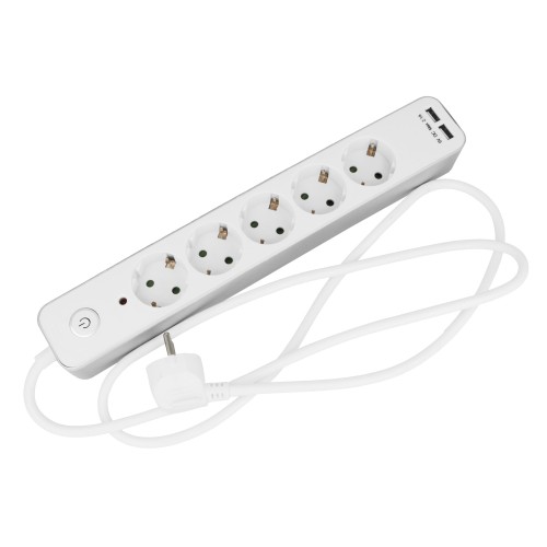 Base múltiple o regleta con 5 tomas Schuko y con toma de tierra. con interruptor y cable de alimentación de alta resistencia y durabilidad, con enchufe en el extremo para obtener un alcance óptimo. 2 tomas USB con 2,1 a de máximo en total. con protección contra descargas eléctricas.