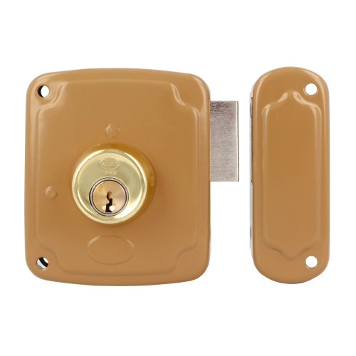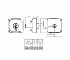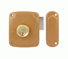 Cerradura de sobreponer para puertas de madera. Cilindro redondo de latón Ø25x50 mm de 5 pines. Con palanca de cierre. Desplazamiento de palanca 20 mm (2 vueltas de llave). 3 llaves de serreta. Llave en bruto modelo 6410.