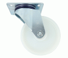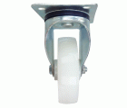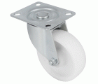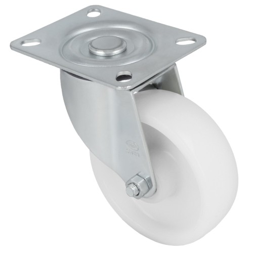 Rueda de nylon blanco. Con pletina metálica. Con rodamiento de rodillos. Diseñadas para cargas elevadas.