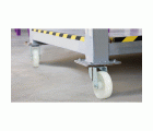Rueda con pletina metálica. Banda y núcleo de nylon blanco. Con rodamientos de rodillos. Especialmente diseñada para contenedores y rollpalets de carga alta.
