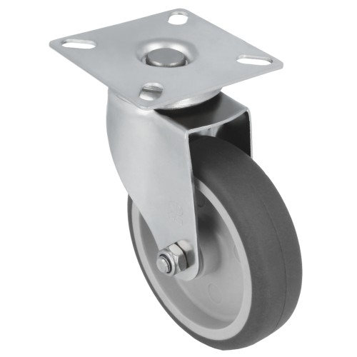Rueda con pletina de acero inoxidable 18/8. Banda de caucho termoplástico. Núcleo de polipropileno. Diseñado para usos hospitalarios, hosteleria y similares