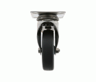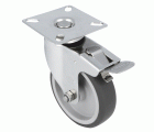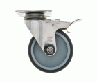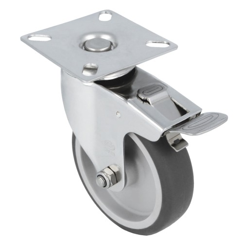 Rueda con pletina y freno de acero inoxidable 18/8. Banda de caucho termoplástico. Núcleo de polipropileno. Diseñado para usos hospitalarios, hosteleria y similares