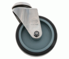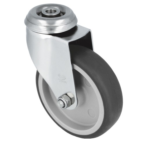 Rueda con pletina de acero inoxidable 18/8 con agujero. Banda de caucho termoplástico. Núcleo de polipropileno. Diseñado para usos hospitalarios, hosteleria y similares