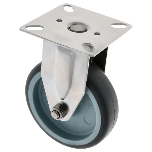 Ruedas fijas con pletina de acero inoxidable 18/8. Diseñado con una banda de caucho termoplástico. Contiene un núcleo de polipropileno. Tienen una gran resistencia y un largo tiempo de vida útil.