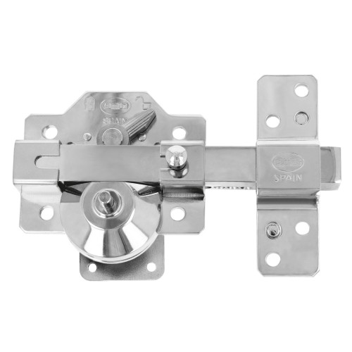 - Cerrojo de sobreponer con cilindro redondo de alta seguridad, pestillo de apertura y palanca interior de bloqueo. Dimensiones: 90 x 154 mm. Longitud del cilindro: 50 mm. Fabricado en Acero con acabado Cromado Brillo. Color Plateado.
