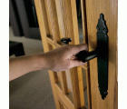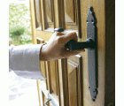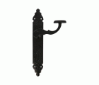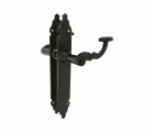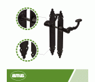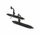 Juego de manillas de zamak con placa martilleada de acero. Cuadradillo de 8 mm. Para puertas de entrada. Incluye accesorios de fijación.