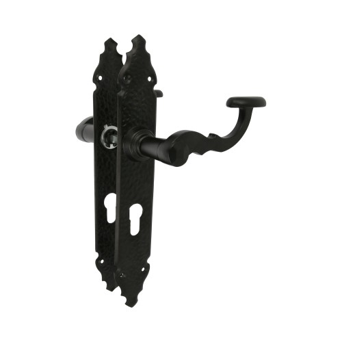 JUEGO DE MANILLAS PARA USO CON CERRADURAS DE EMBUTIR: Juego de manillas de zamak con placa martilleada de acero y bocallave troquelada para cilindro Europerfil. Su diseño en estilo forja la hace muy decorativa. En color negro, un color neutro muy combinable con cualquier color de puerta.
