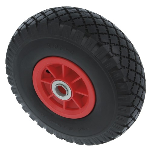- Rueda neumática impinchable con núcleo termoplástico o llanta en color rojo. Con rodamientos de bolas. Medidas: Diámetro Ø260 x 85 mm. Para eje de 20 mm.