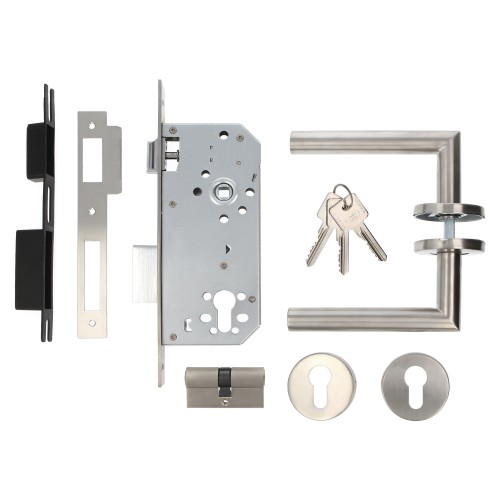 Juego de manillas modelo 7RCX de acero inoxidable con roseta redonda. 1 cerradura con paletón entrada 50 mm y distancia entre nuecas de 85 mm de acero inoxidable y un cilindro de seguridad (30-30 mm) en latón cromo mate. Para puertas de carpintería de madera.