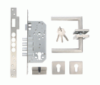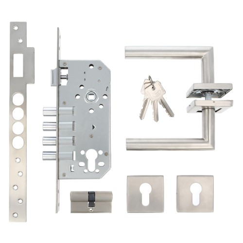 Juego de manillas modelo 7RBX acero inoxidable con roseta cuadrada. 1 cerradura de bulones entrada 50 mm y distancia entre nuecas de 85 mm de acero inoxidable. 1 Cilindro de seguridad (30-30 mm) en latón cromo mate. Para puertas de carpintería de madera.