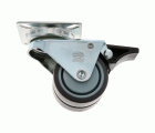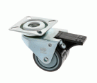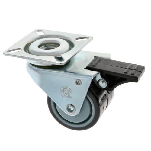 Rueda doble de diámetro 50 en goma gris con placa giratoria y freno. Uso semi-industriales y mobiliario con diferentes aplicaciones, utilizadas para el transporte de cargas medianas como mobiliario hospitalario, camas, carros supermercado, etc...