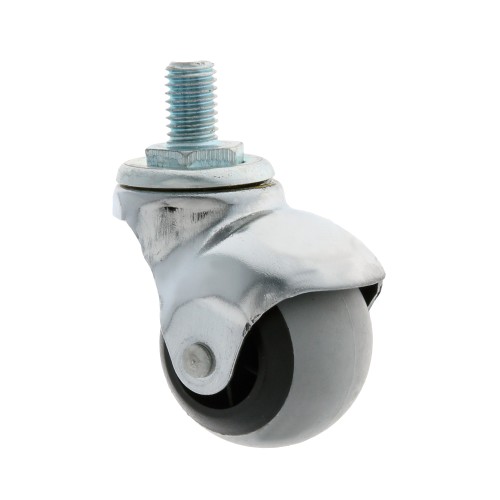Rueda tipo bola en goma gris y polipropileno negro. Con carcasa niquelada y eje roscado. Buena resistencia a la abrasión y silenciosa. Uso semi-industrial y mobiliario.